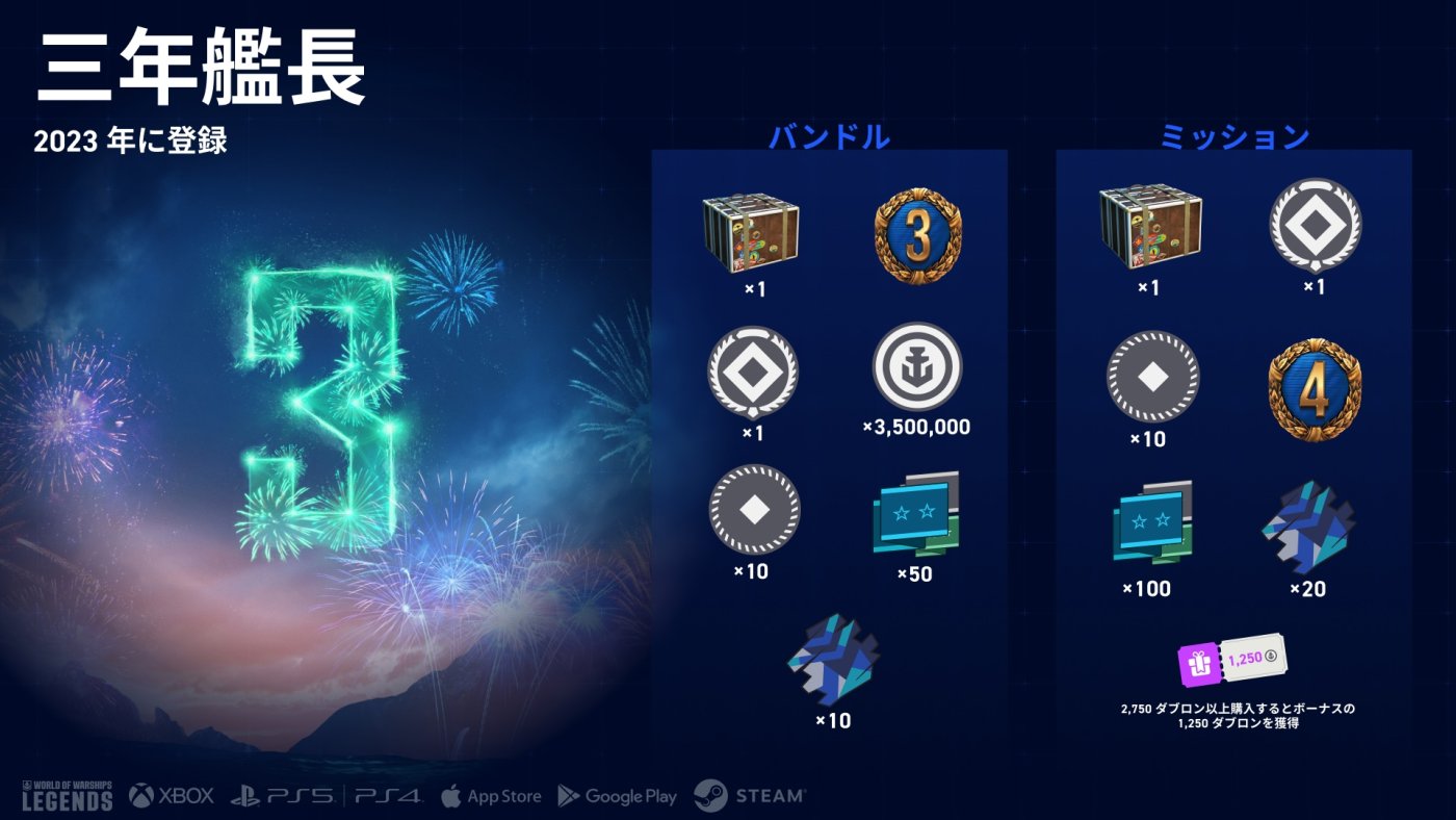5 月 4 日までにストアの「注目」または「アニバーサリー」タブからロイヤルティ褒賞を受け取りましょう!『World of Warships: Legends』のプレイ期間が長いほど、ギフトが豪華になります。各バンドルには追加褒賞を獲得できる特別ミッションも含まれています。以下が褒賞の内訳です。