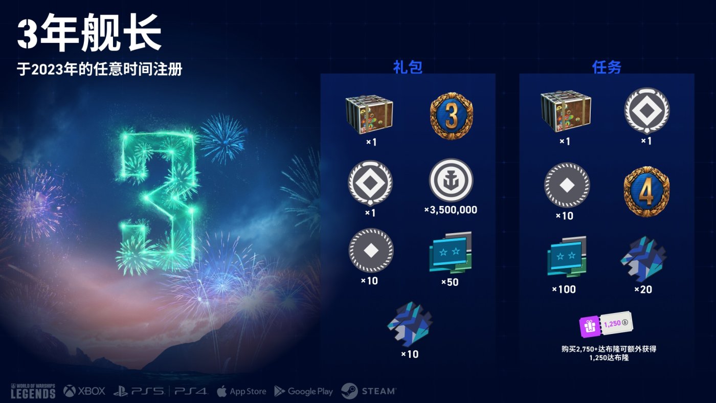 请在5月4日前从商店的“精选”或“周年纪念”版块领取您的忠诚度奖励!您在《战舰世界:传奇》中游玩的时间越长,这份礼物就越有价值。每个礼包还包含一个特殊任务,提供额外奖励。以下是完整的奖励明细:
