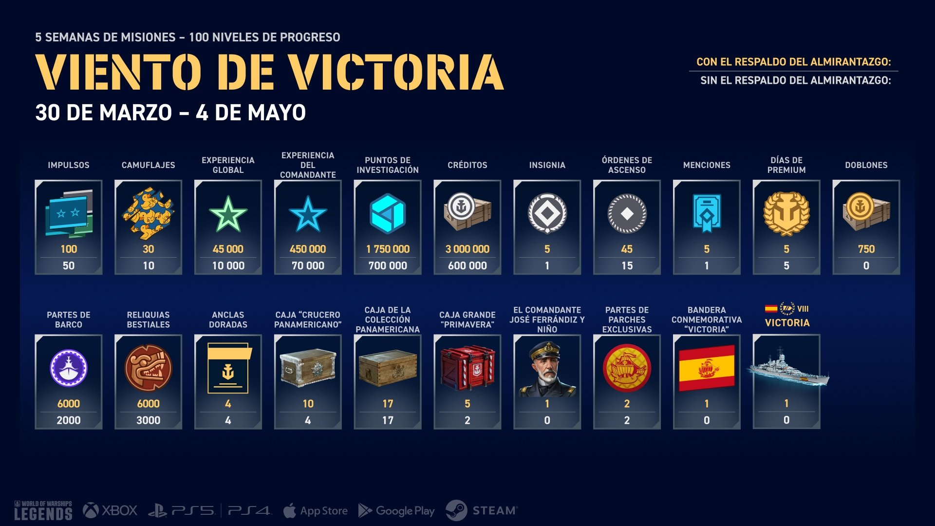 ¡La campaña “Viento de victoria” está comenzando! Durante las próximas 5 semanas, finalicen sus 100 metas con un Respaldo del Almirantazgo activo para desbloquear al acorazado Premium español Victoria de Nivel VIII y otras recompensas. El Victoria está equipado con la característica distintiva de los barcos españoles en Legends: el cargador múltiple, el cual le permite disparar dos salvas consecutivas. Aunque lleva bastante tiempo recargar su cargador múltiple, esto puede ser reducido significativamente a través del uso del consumible Impulso a la Recarga de la Batería Principal. Además, el Victoria también cuenta con una buena velocidad y una excelente maniobrabilidad.