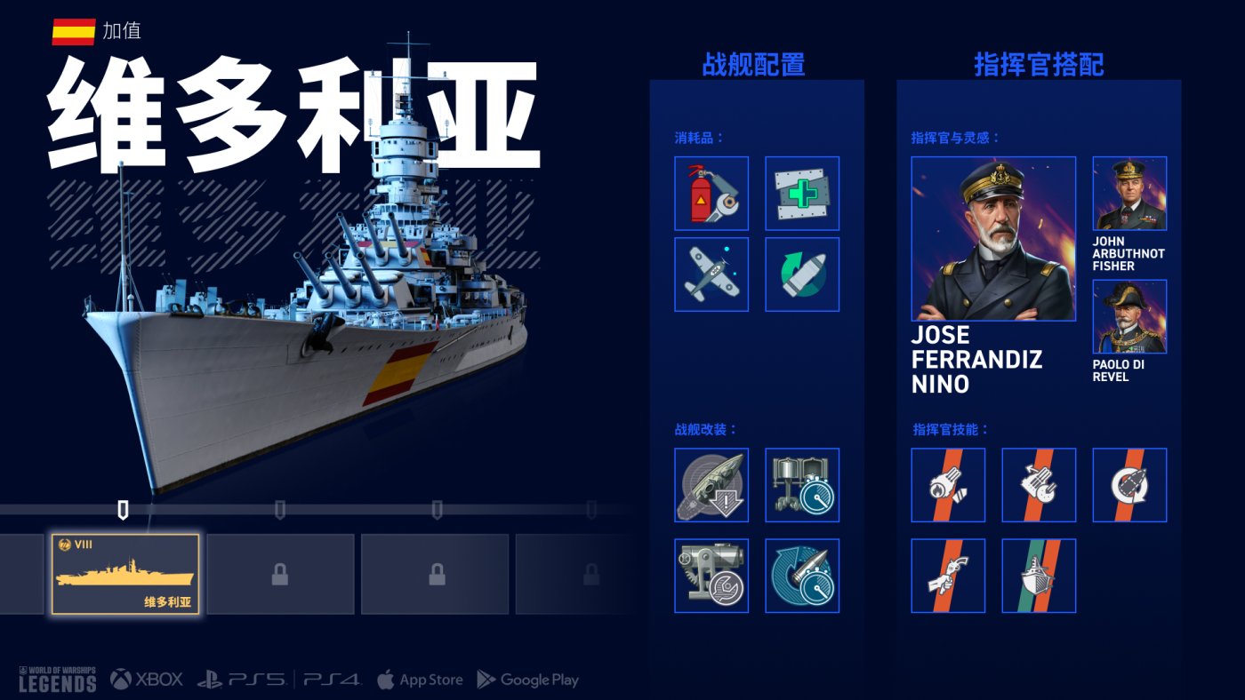 José Ferrándiz y Niño是维多利亚号的绝佳指挥官人选。其获取方式与战舰相同——即激活海军部的支持并完成胜利之风战役。他的基础技能舰队设计师,可改善您战列舰主炮的炮弹弹着群和误差,最多2.5%。